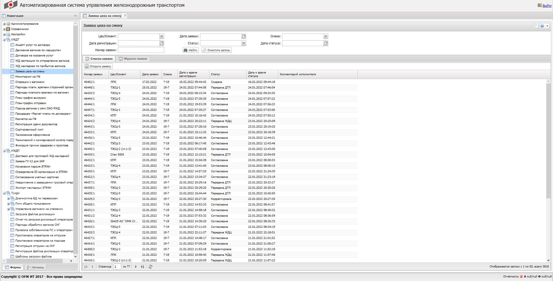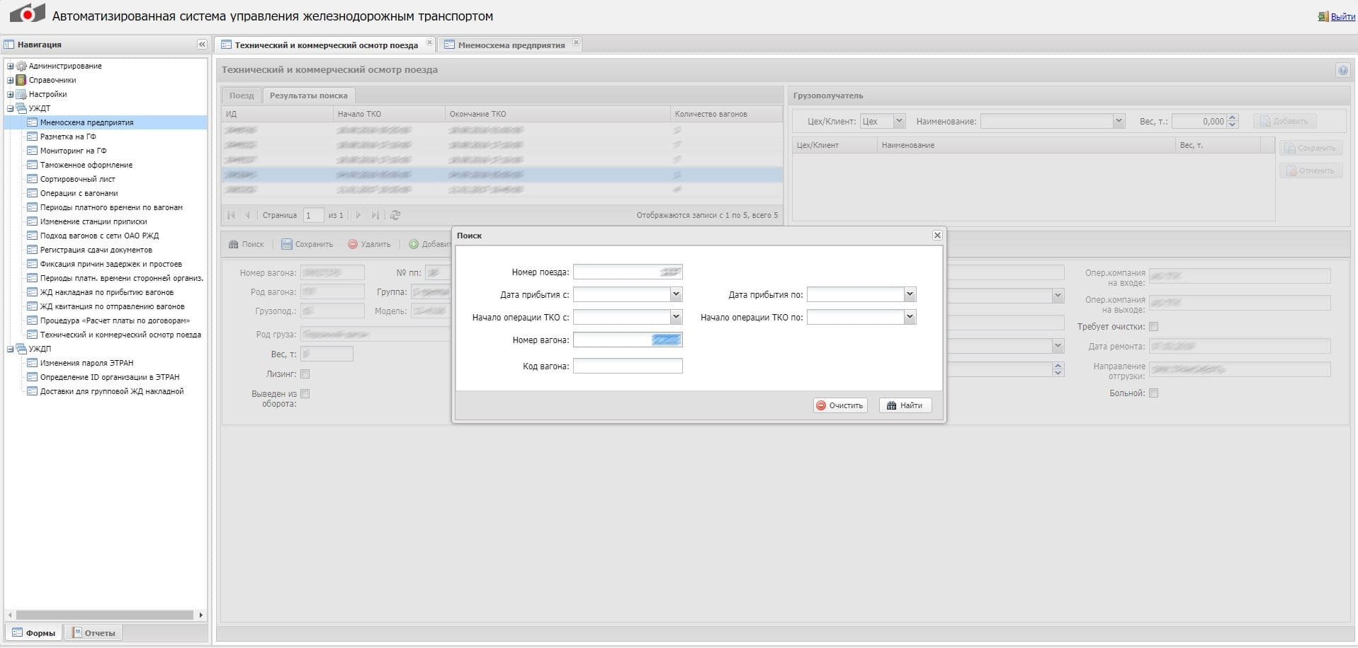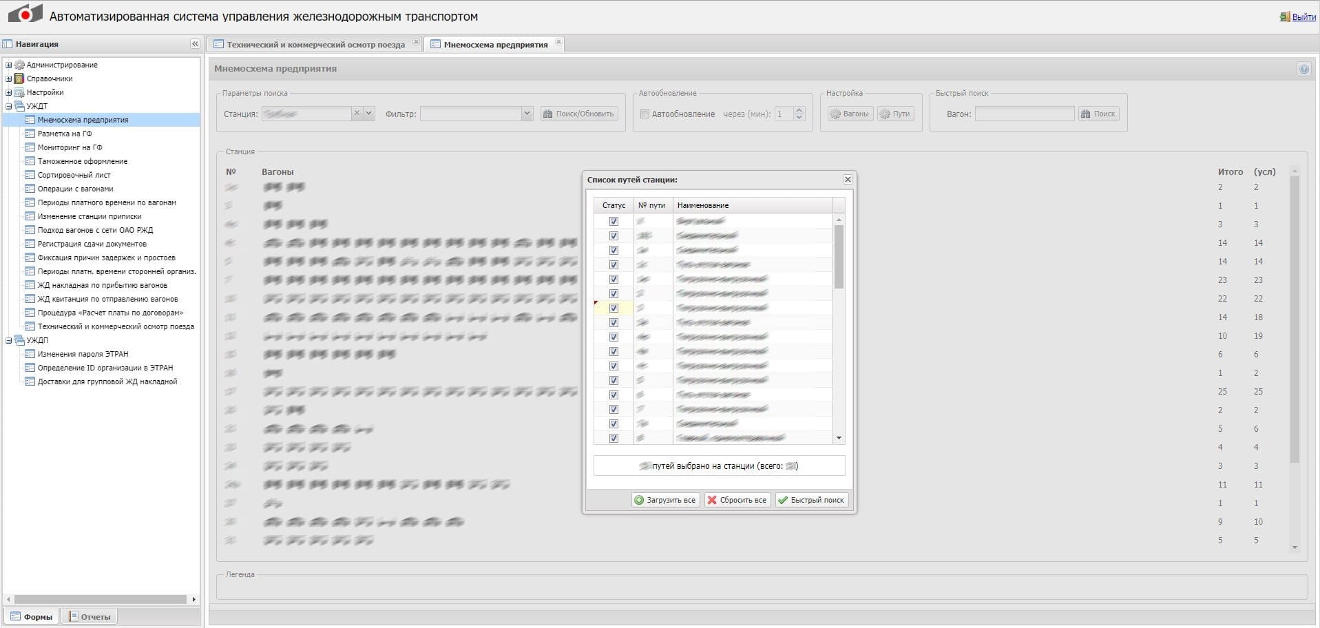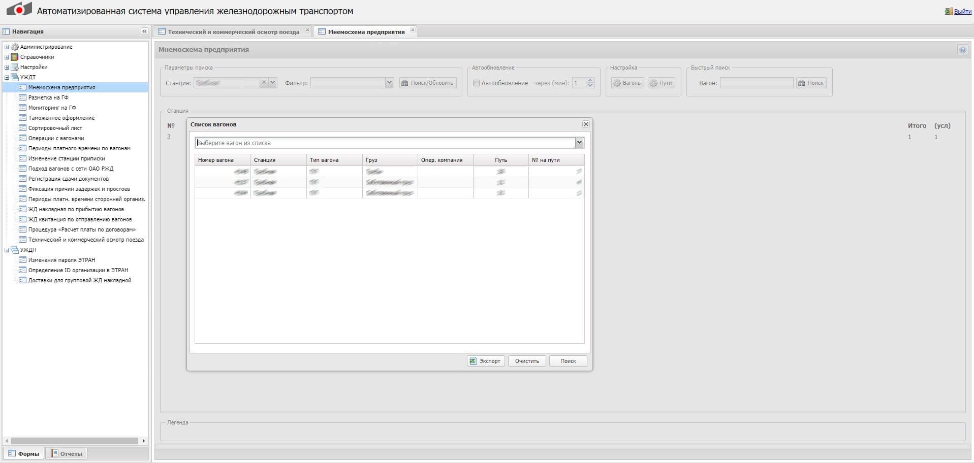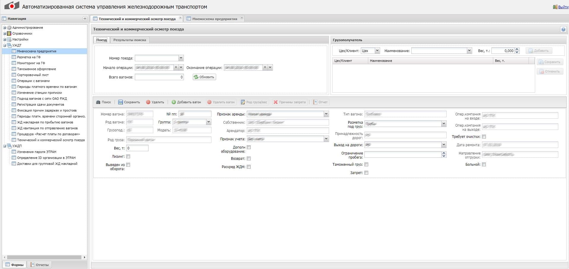 Реализованы механизмы для отслеживания актуального расположения вагонов на станциях, получения отчетности и инициации перестановки вагонов, для работы с данными о техническом и коммерческом осмотре вагонов, для работы с информацией о перевозках на внешних ЖД путях, планирование графиков операций с вагонами, отслеживание нарушений планирования, движения вагонов по маршрутам и других функций. Разработаны шаблоны отчетов в FastReport и интегрированы в систему управления.