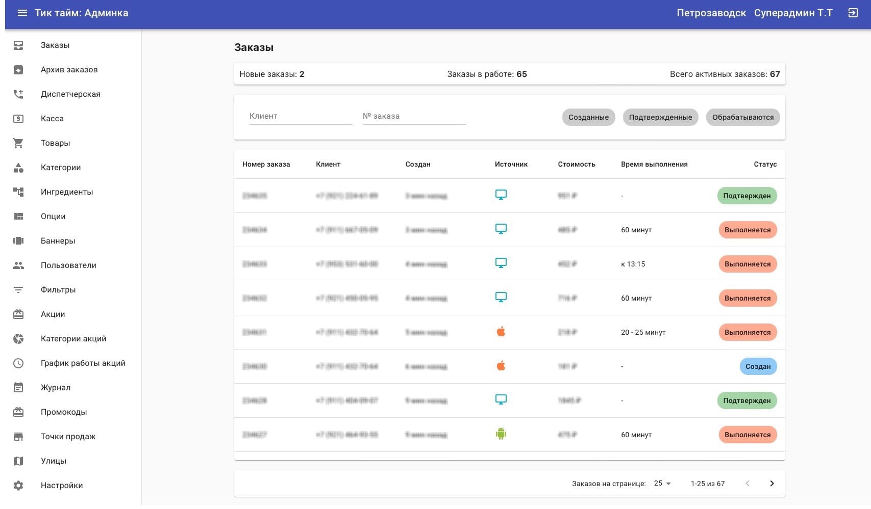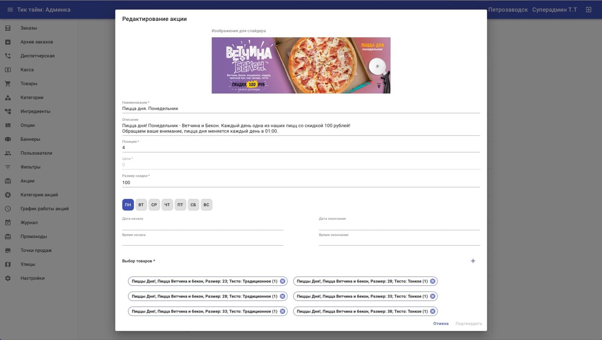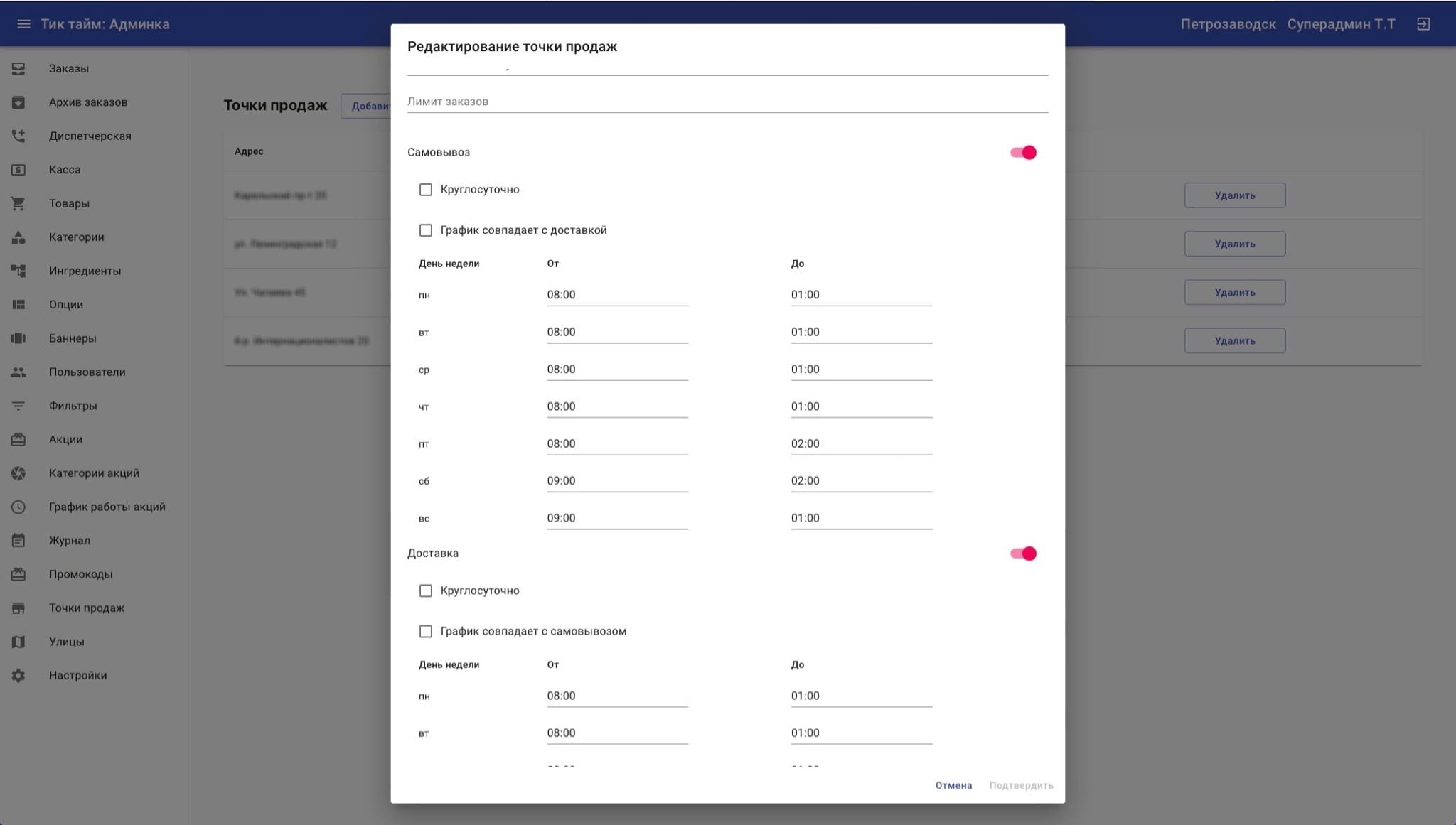 Система управления позволяет настраивать доступное меню и расписание работы всех торговых точек, гибко регулировать опциональность продуктов, акции, промокоды, различные фильтры. Для автоматического распределения заказов по точкам продаж реализована возможность настраивать привязку всех улиц и районов города к определенным пиццериям.