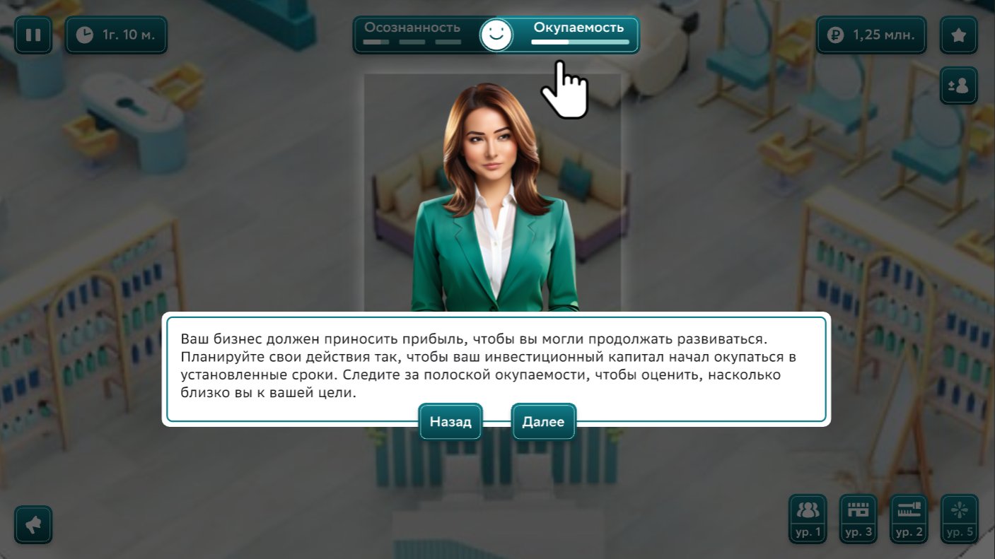 Браузерная игра в жанре экономического симулятора, нацеленная на повышение финансовой грамотности начинающих предпринимателей и продвижение в их среде продуктов Сбера.